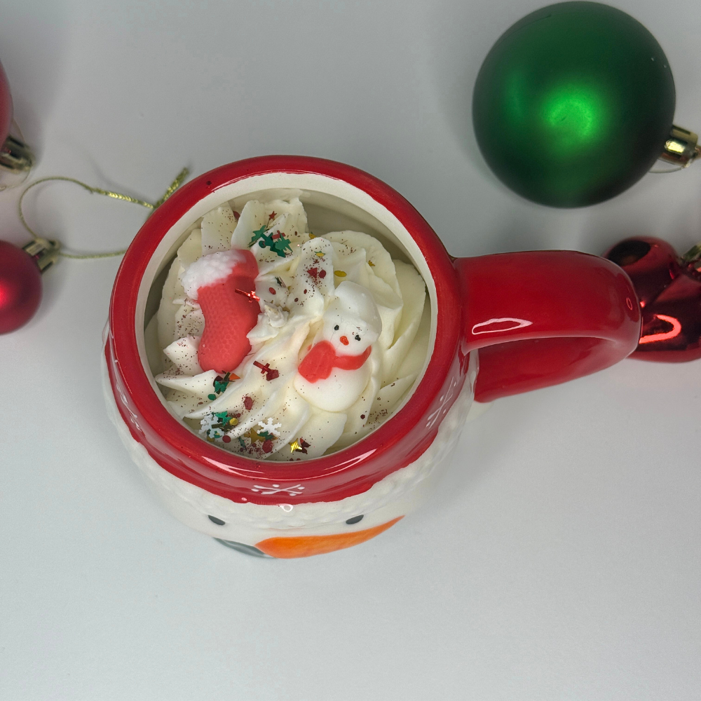 Cozy Snowman Mug Candle brengt direct winterse gezelligheid in huis! Handgemaakt met romige sojawas, feestelijke koolzaadwas-figuurtjes en de warme geur Geur van Kerstmis. Een charmant en vrolijk decoratiestuk dat perfect is als kerstcadeau of om je eigen huis extra knus te maken. ⛄✨