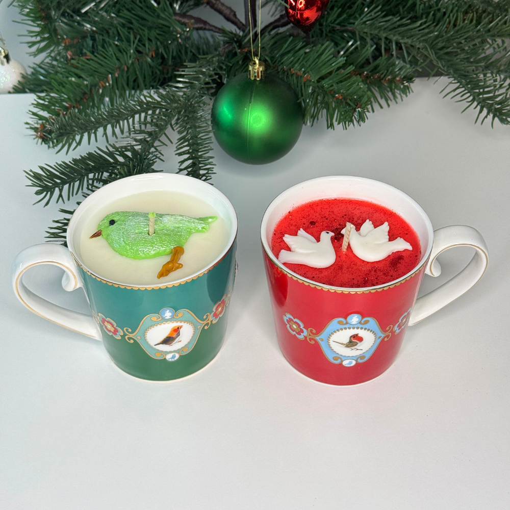 Handgemaakte sojakaars • Dennenboomgeur • Koolzaadwas vogeltoppers • Herbruikbare Pip Studio mok