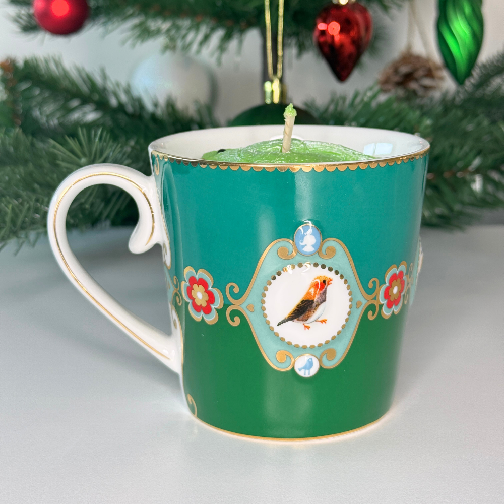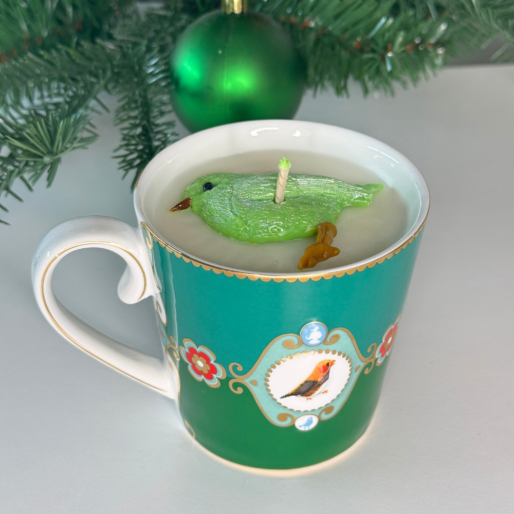Handgemaakte sojakaars • Dennenboomgeur • Herbruikbare Pip Studio mok • Luxe groene vogel-topper
