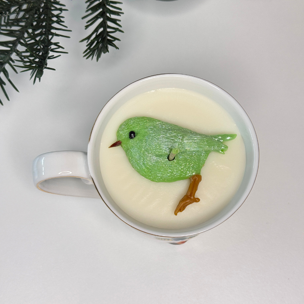 Gemaakt van natuurlijke sojawas en afgewerkt met een handgemaakte koolzaadwas-vogel, voor een luxe en feestelijke uitstraling.
